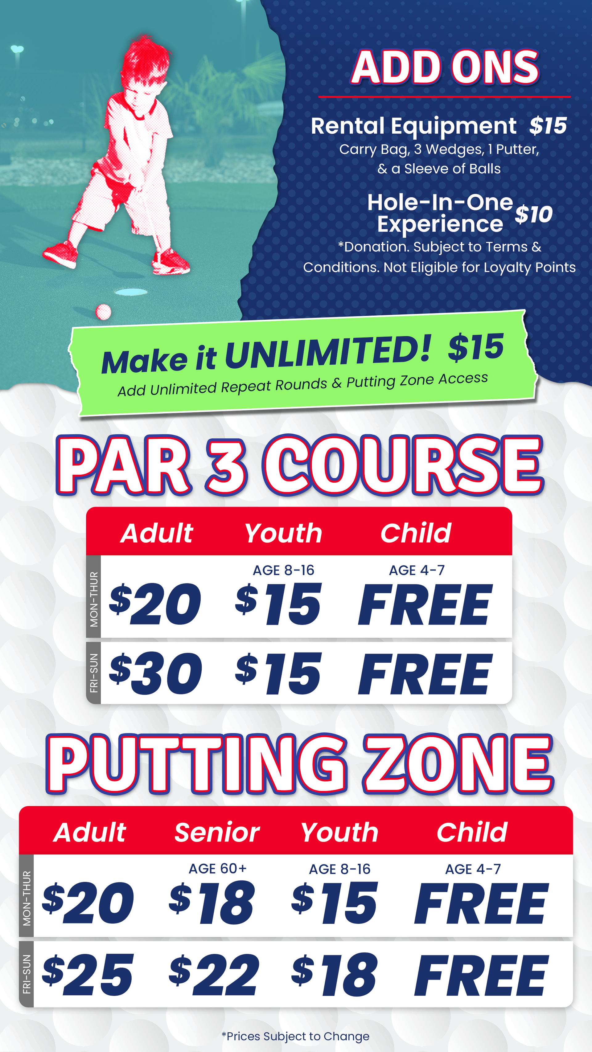 Our Par-3 course and Putting Course are walk-up only — no reservations needed, just show up and play!