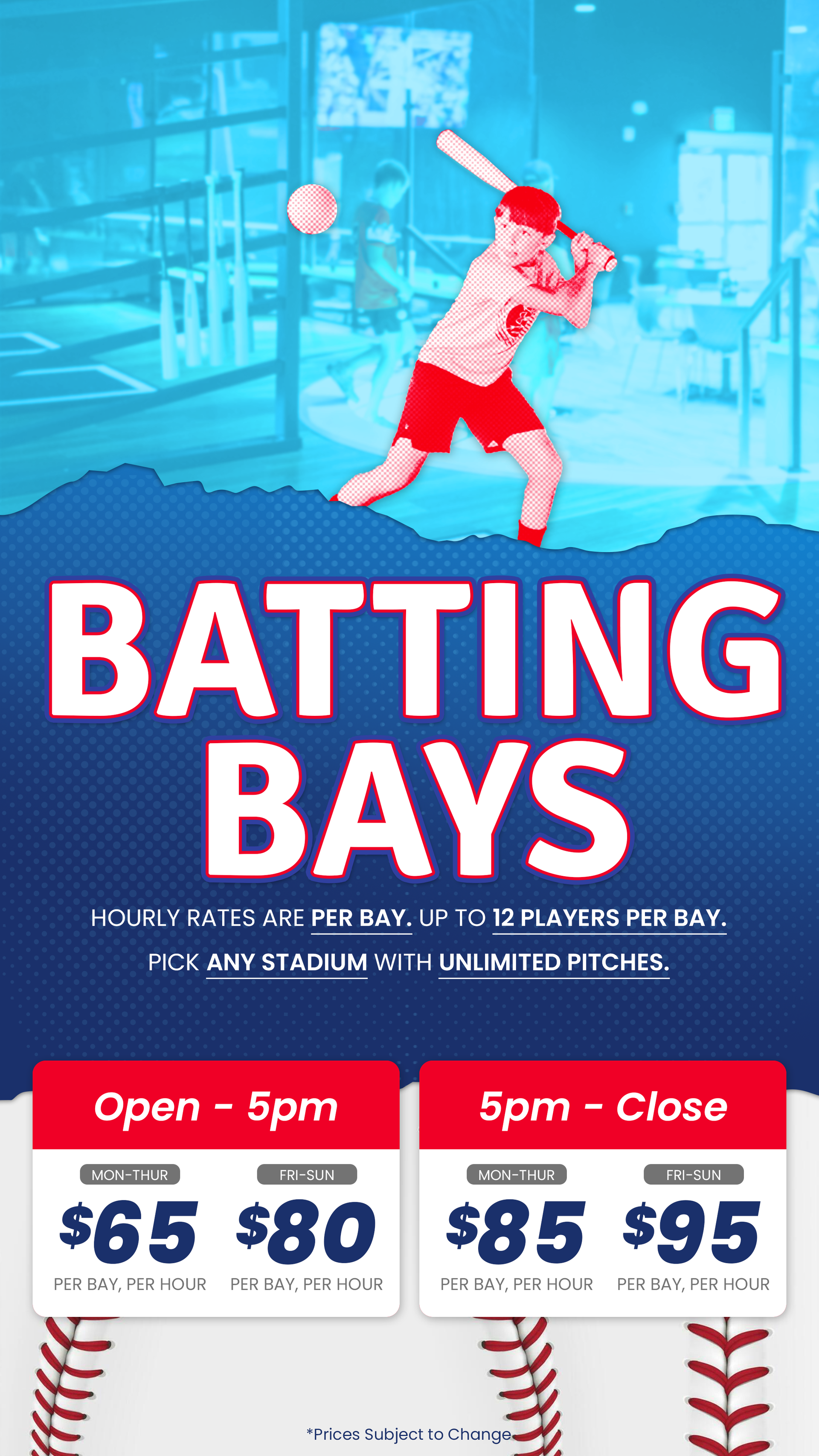 Unleash your inner slugger in the Batting Bays with unlimited pitches and high-energy fun for guests age 6 and up.